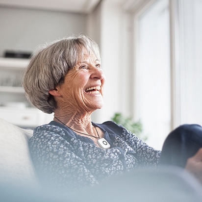 Woman wearing Medical Alert's Mini Mobile System pendant sitting on couch